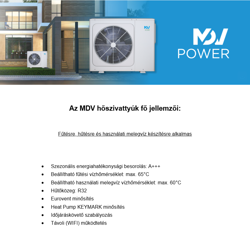 Ön éppen véleményezi: MDV MDVC-V9WD2ER8-P MDV Power monoblokkos hőszivattyú (R32, 9 kW, 1 fázis)
